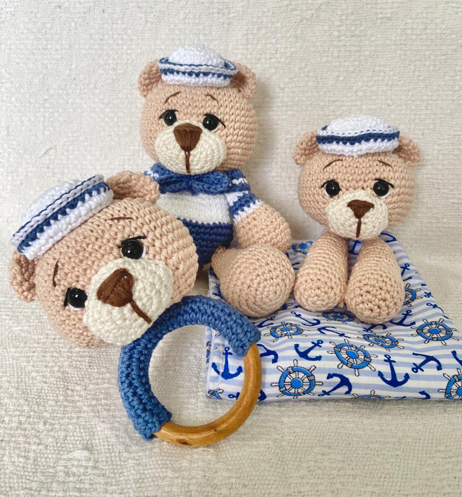 Kit para bebê confeccionado na técnica amigurumi. O kit contém: 1 ursinho (25 cm), 1 chocalho e 1 naninha, todos em linha 100% algodão mercerizado, fibra sintética antialérgica. Os olhos possuem trava de segurança. O tecido da naninha é soft e tricoline.