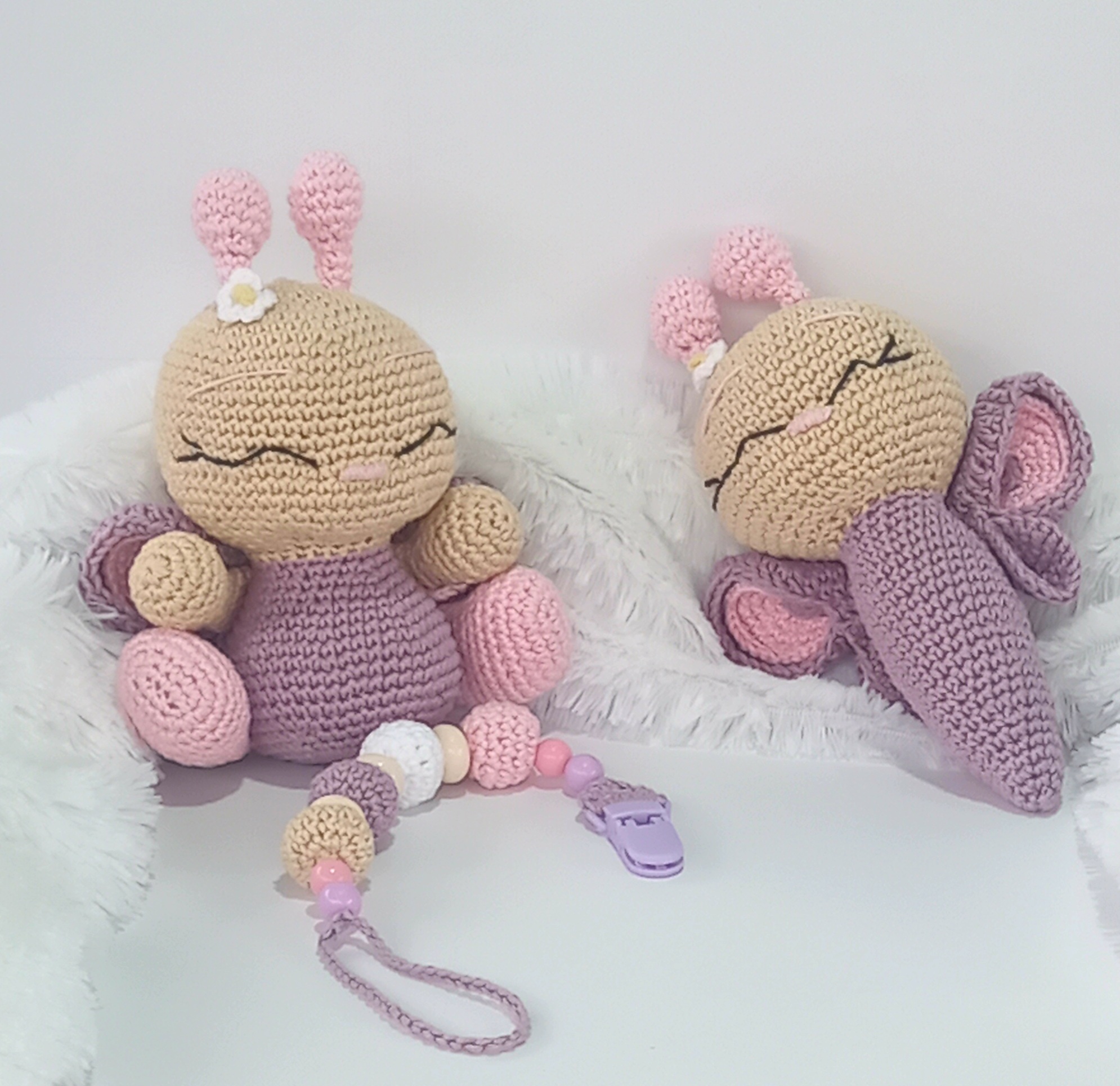 Kit borboleta em amigurumi, contendo 1 borboleta, 1 chocalho borboleta e 1 prendedor de chupeta. Linha 100% algodão, fibra siliconada antialérgica, contas acrílicas.