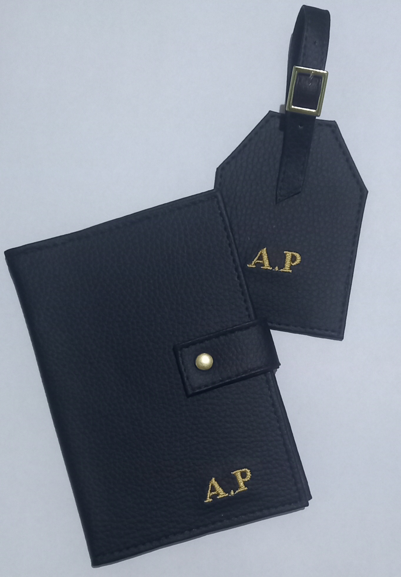 As peças são confeccionadas em material sintetico. A carteira comporta até 2 passaportes ou 1 passaporte e documentos, além de 3 cartões de crédito. As peças podem ser personalizadas com as iniciais ou o nome.
